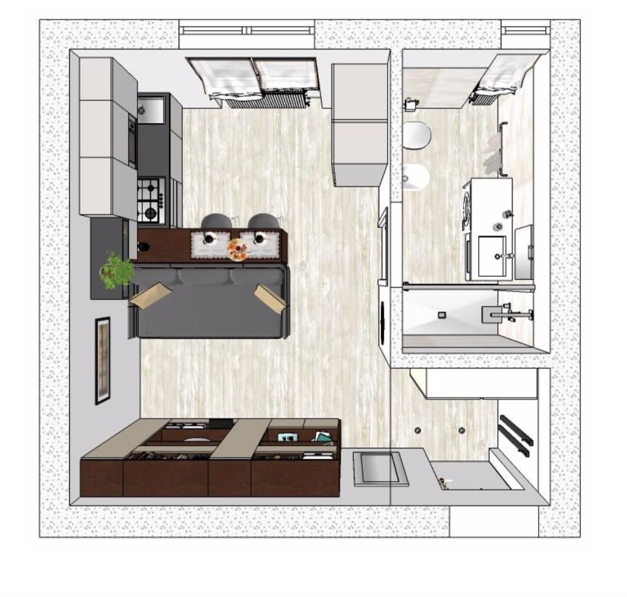 • Cucina completa di elettrodomestici: piano cottura a induzione, lavastoviglie, forno microonde e frigorifero con congelatore